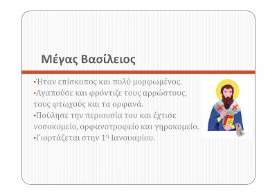 Τις υπόλοιπες δύο ώρες τις αφιερώσαμε στην μεγάλη γιορτή των Αγίων τριών Ιεραρχών. Μιλήσαμε για το βίο των Αγίων και διαβάσαμε κάποιους από τους σοφούς λόγους τους. Στο τέλος φτιάξαμε τη δική μας εικόνα (τα παιδιά που δεν πρόλαβαν, θα ολοκληρώσουν την εικόνα τη Δευτέρα).